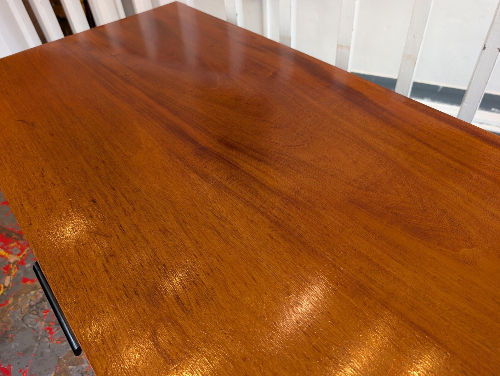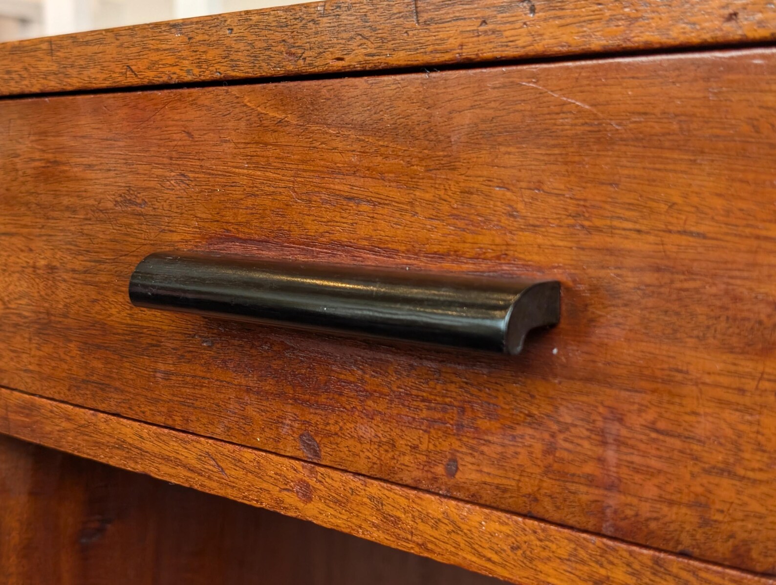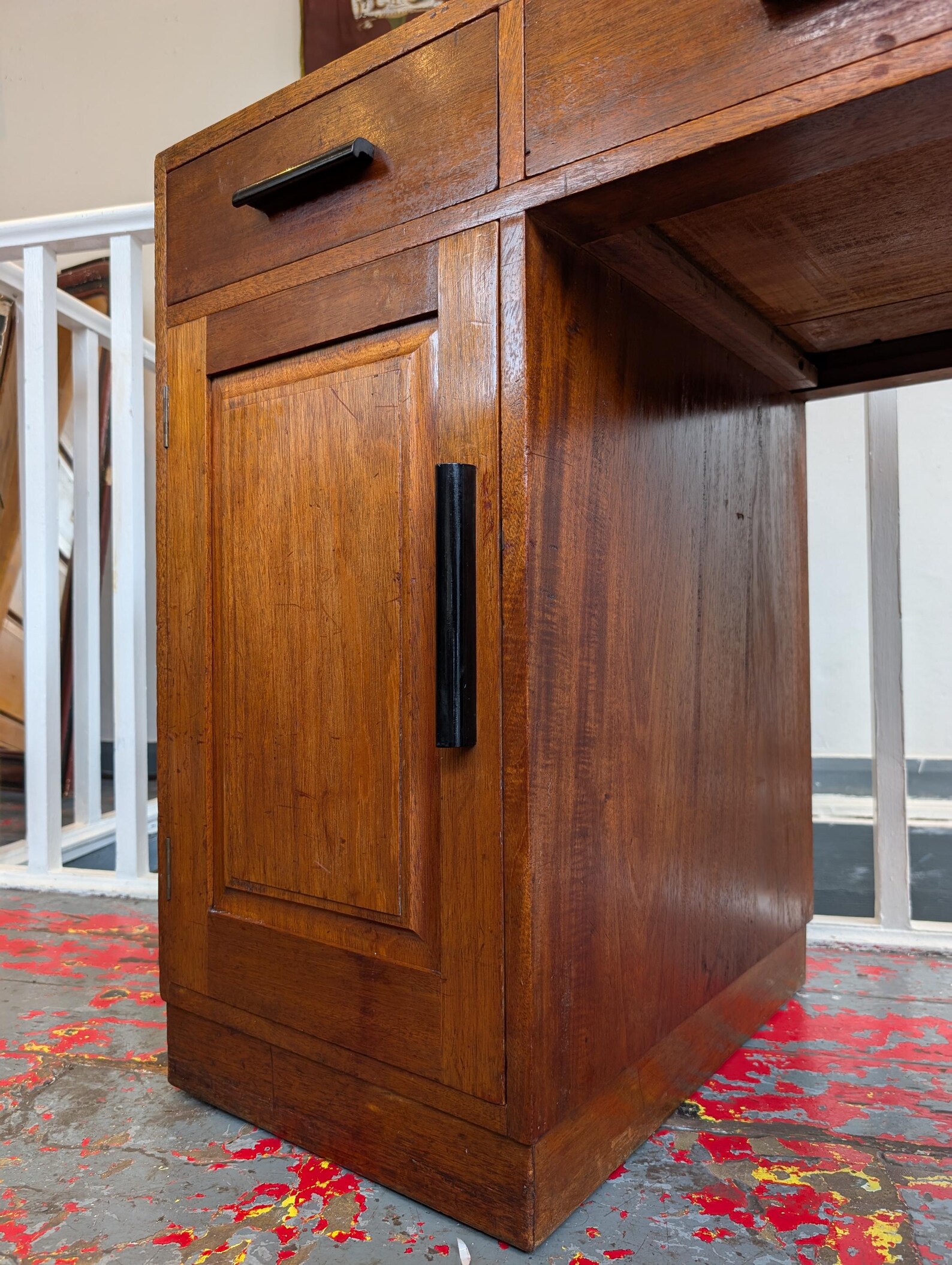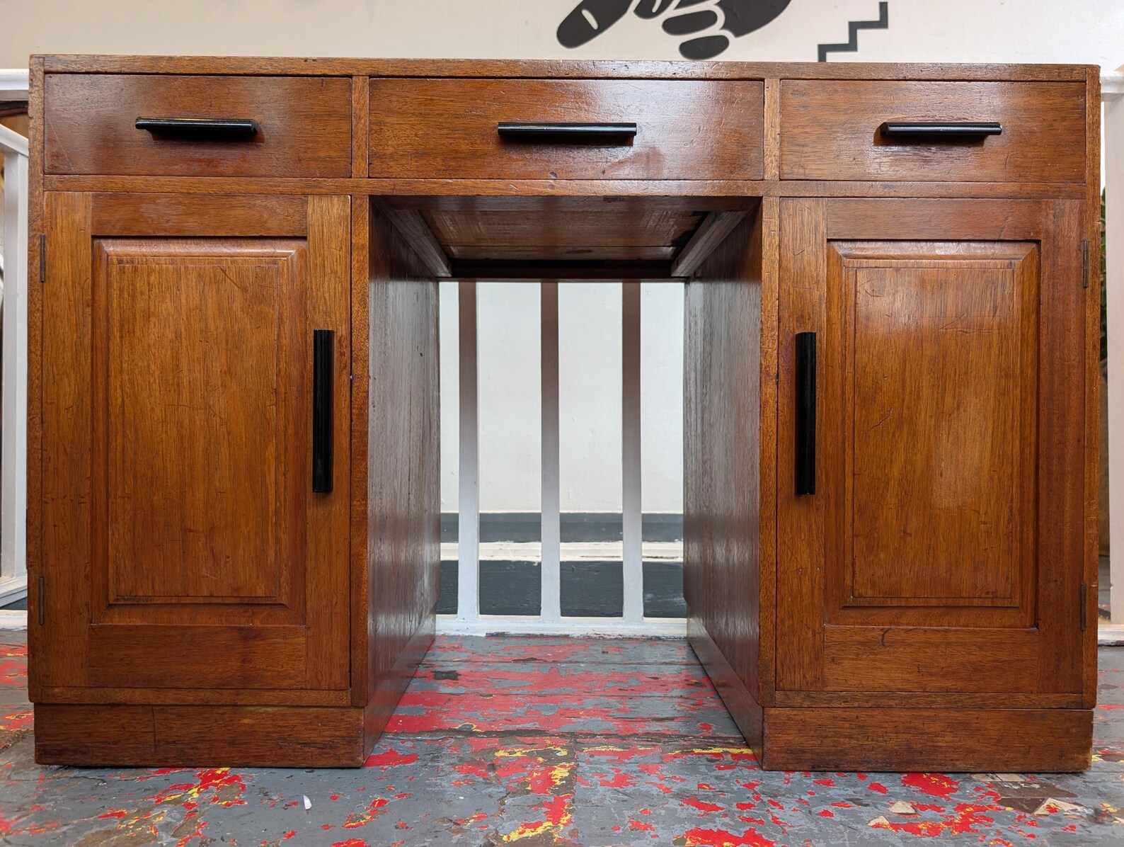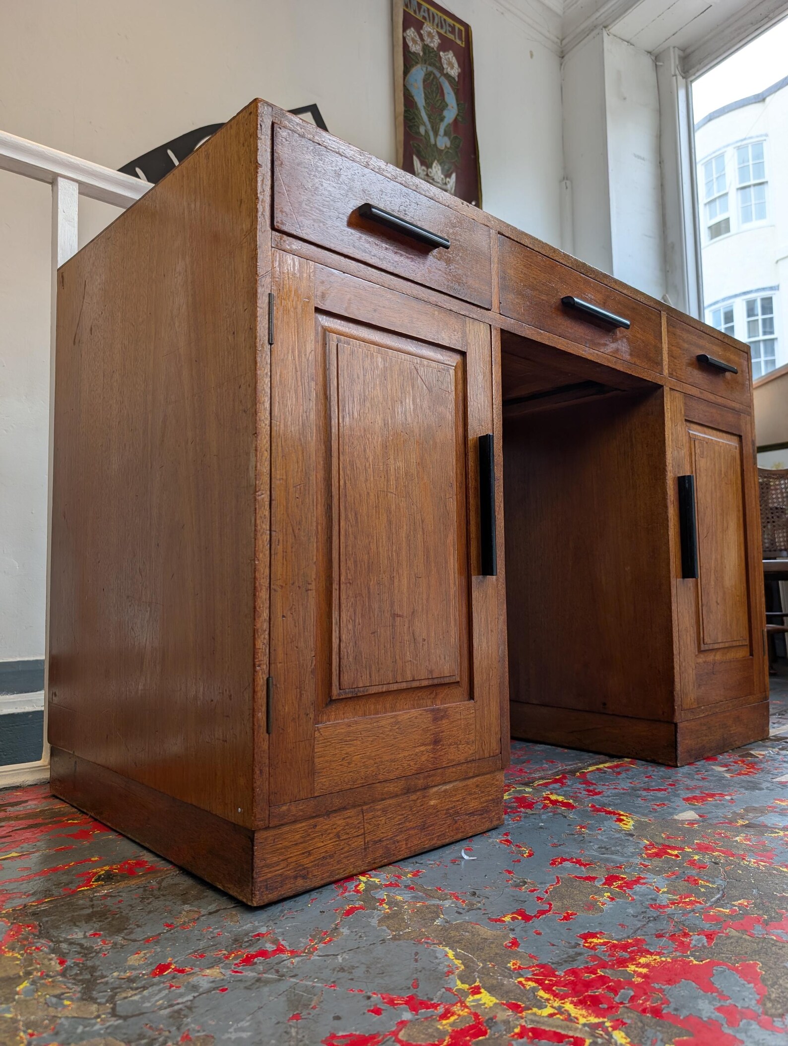 An exceptional piece of 1940s Art Deco design this marvellous double sided partners or clerks Desk is in a gorgeous Oak with charming ebonised handles across the three drawers and pair of cupboards. With some lovely detailing and grain to the 360 degree finish this piece oozes quality and can sit anywhere in the room rather than just flush to a wall.