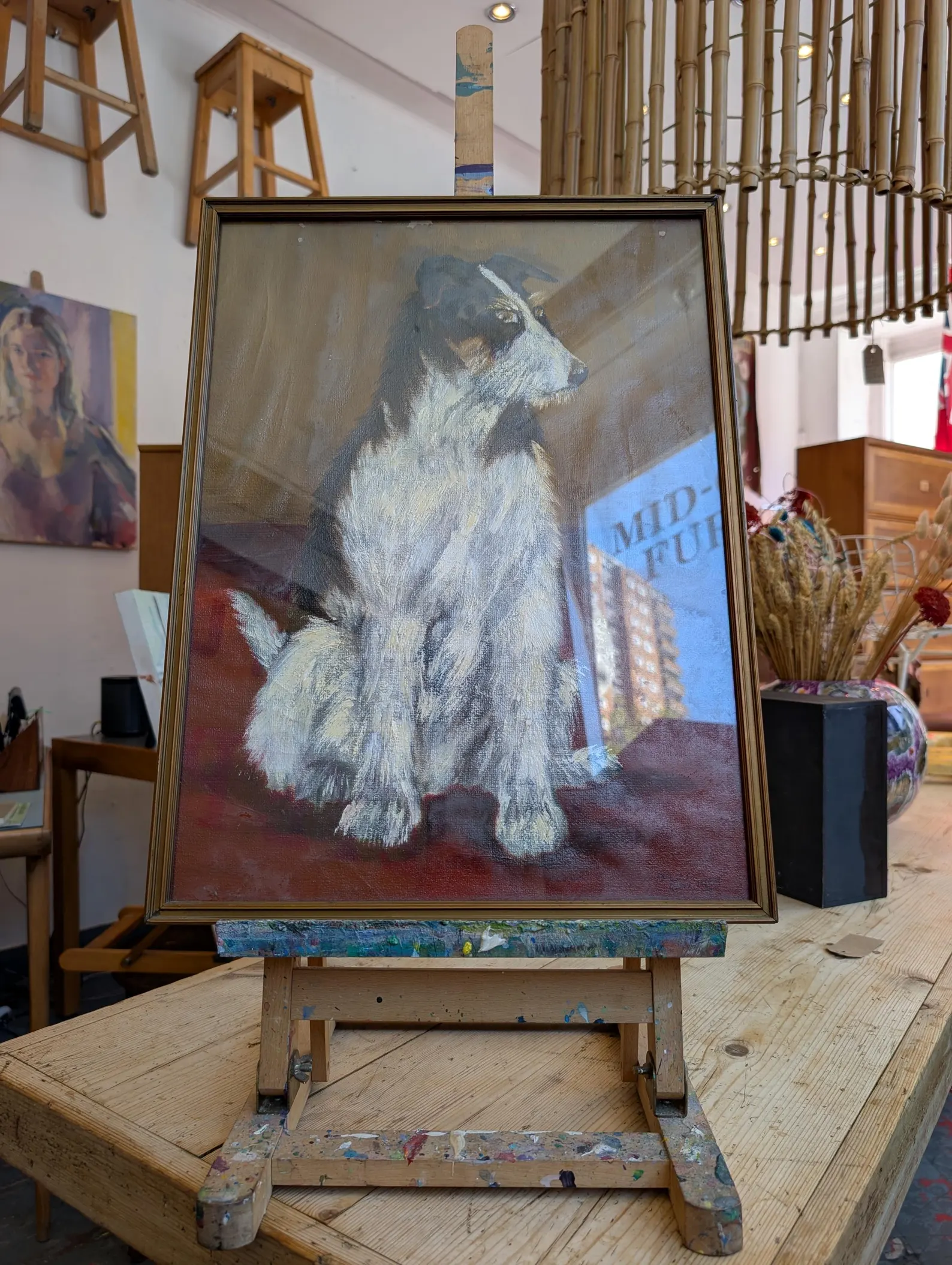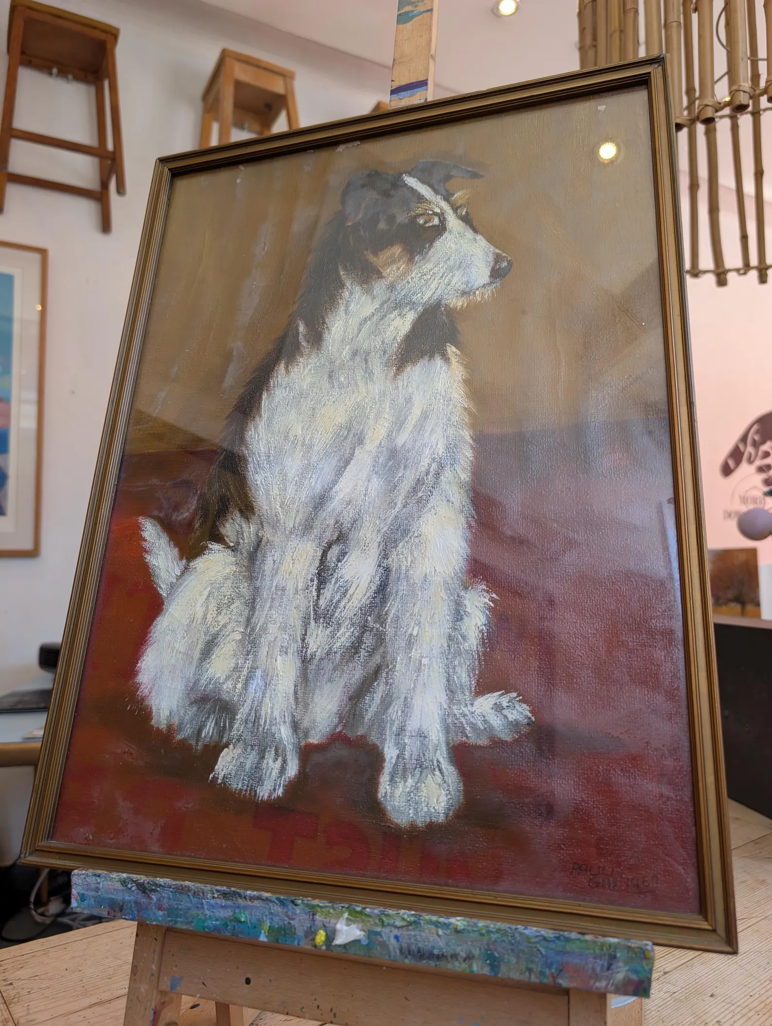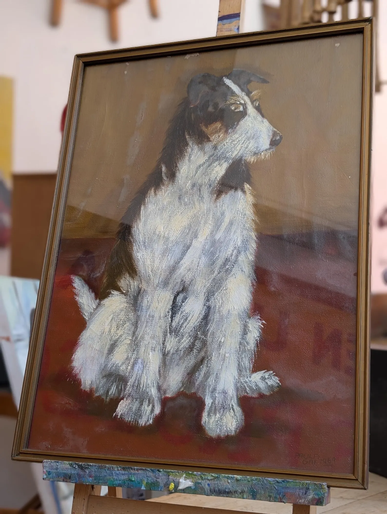 1960s Framed Oil on Board Signed Dog Portrait Painting by Paula Gay.