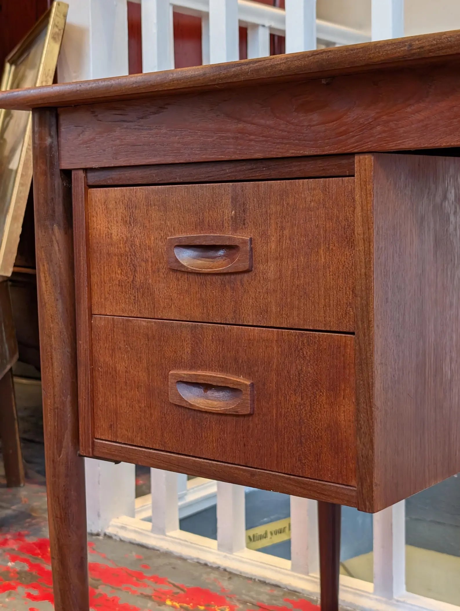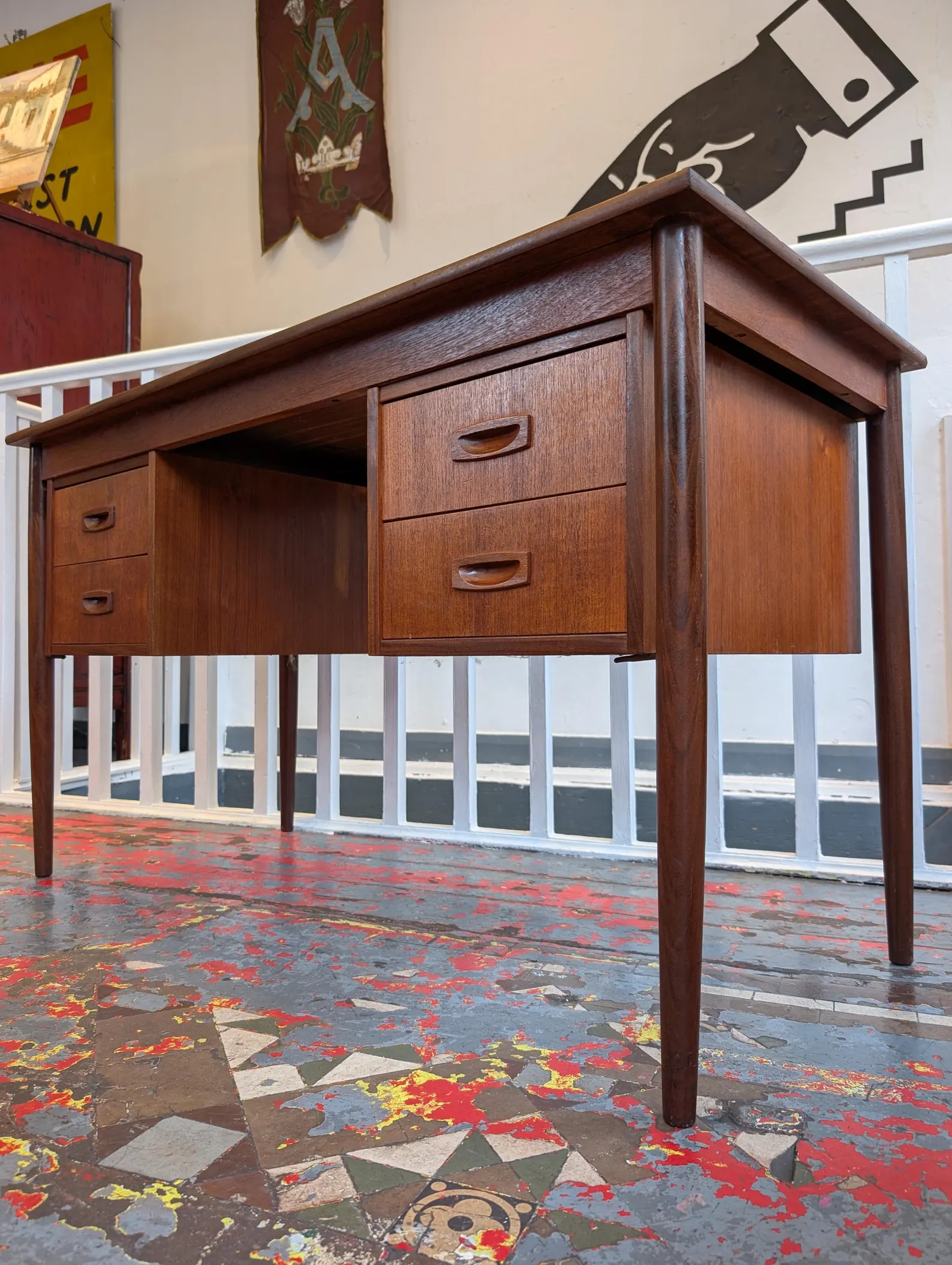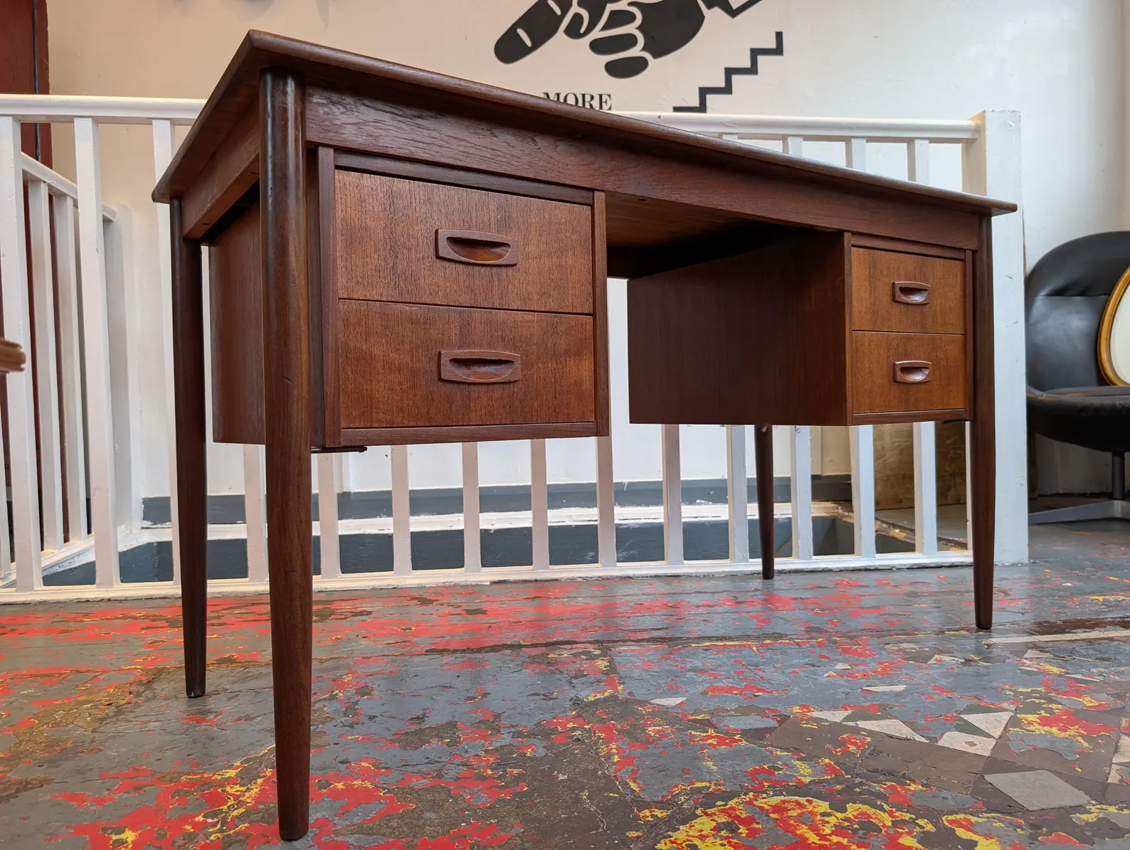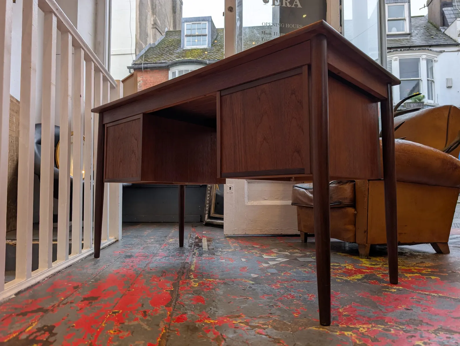 A classic mid century Scandinavian design this 1960s Kneehole Desk in Teak has beautiful and timeless form, with a finished back and ample storage and work space. Danish design and practicality at it’s best!