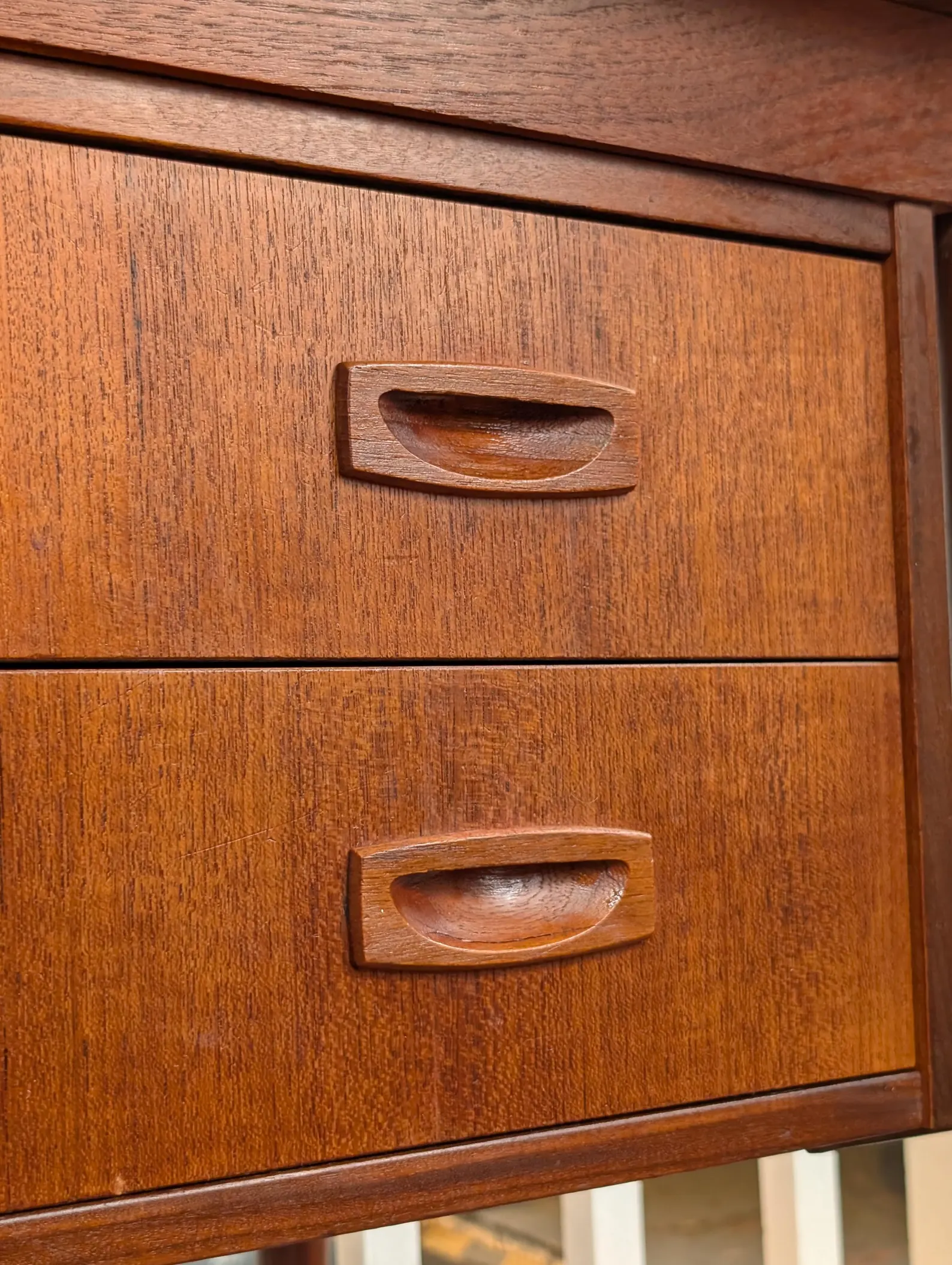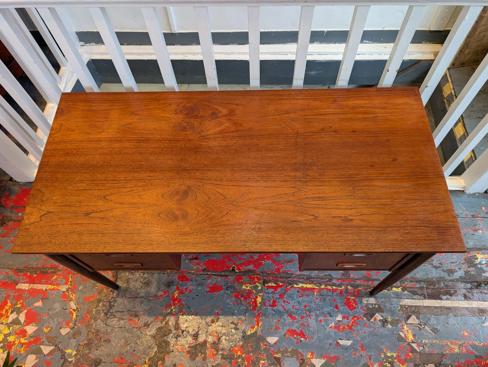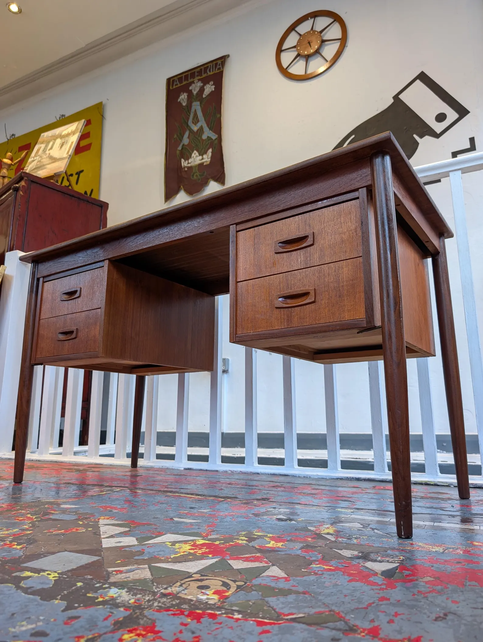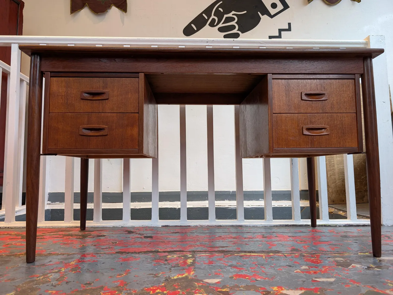 A classic mid century Scandinavian design this 1960s Kneehole Desk in Teak has beautiful and timeless form, with a finished back and ample storage and work space. Danish design and practicality at it’s best!