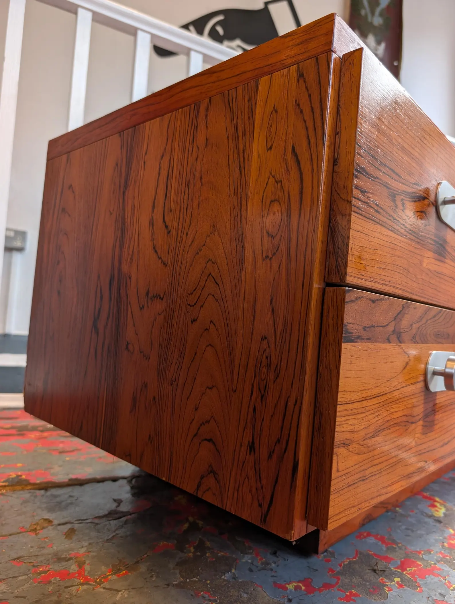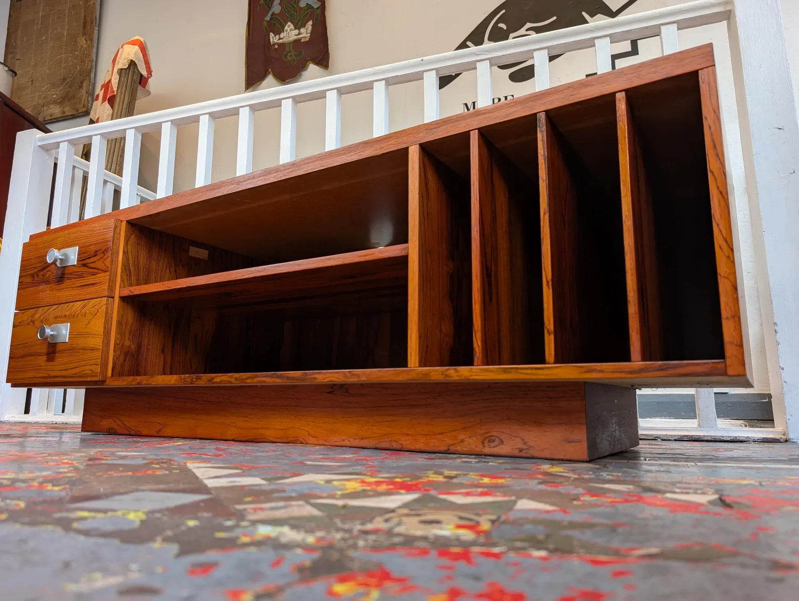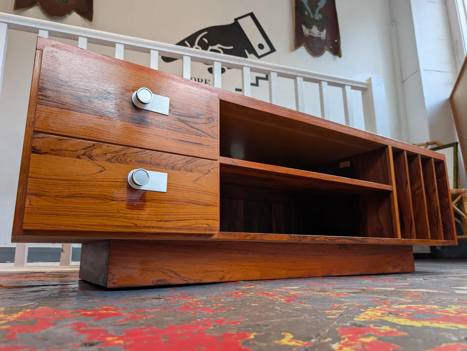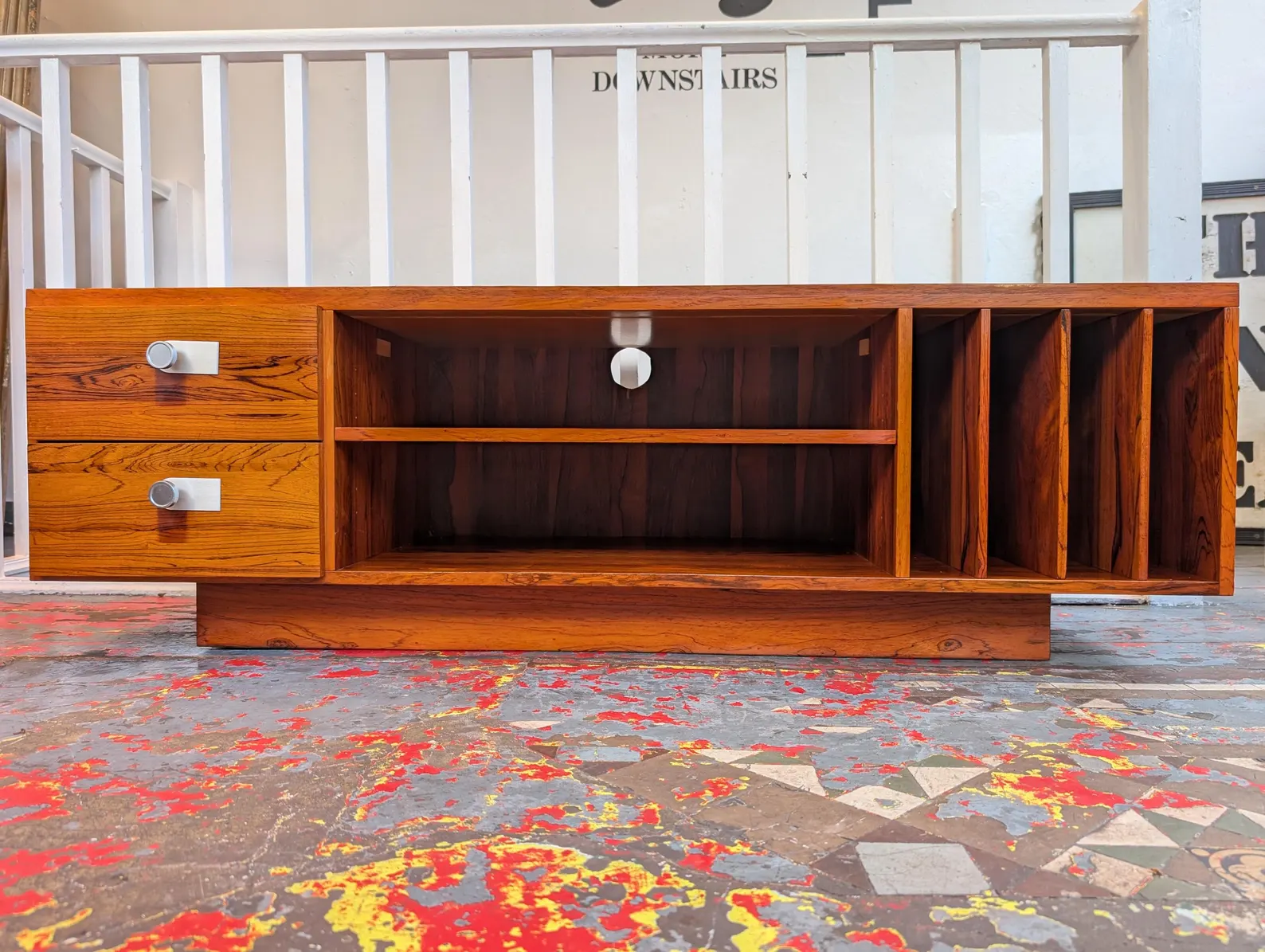 Dating from 1970s Sweden and designed by high end furniture makers Troeds this exceptionally striking Media Cabinet or Sideboard is in a stunning Rosewood with beautiful grains to the finish. Perfect as a TV Unit or Record Cabinet this sleek design will add something special to any mid century or contemporary led interior.