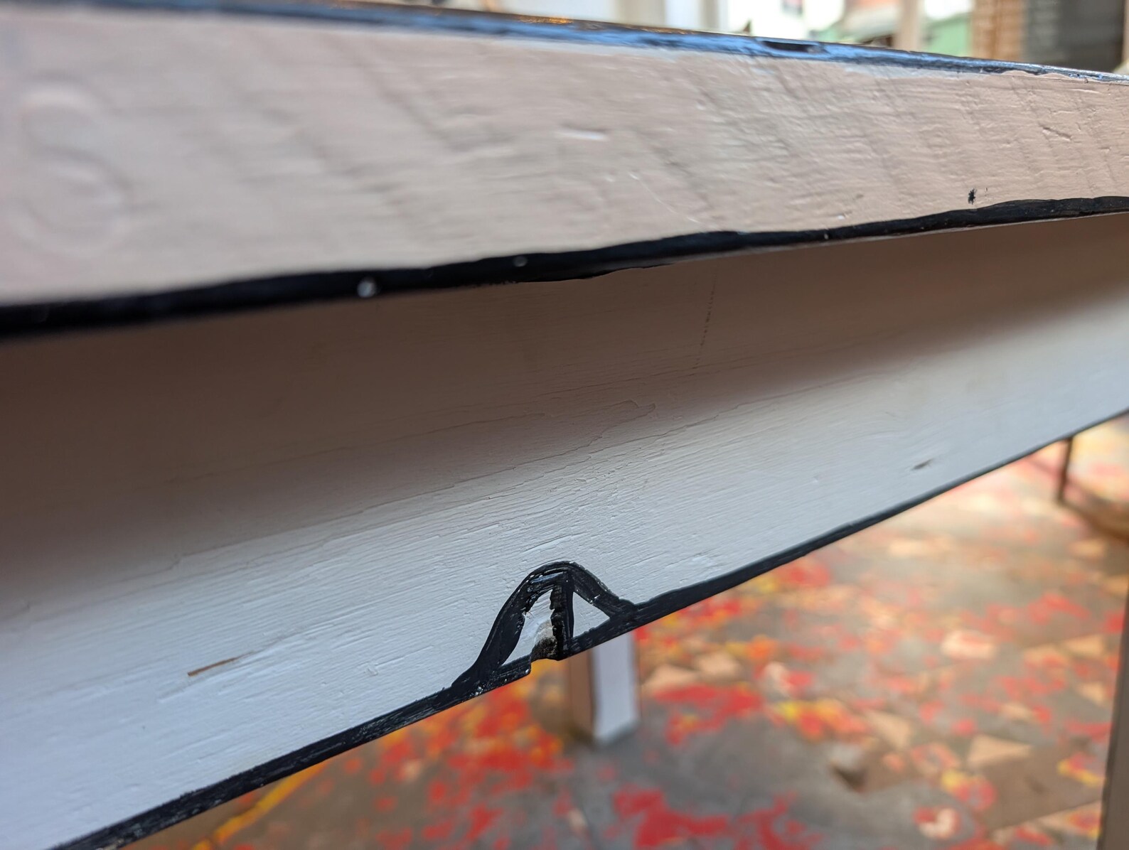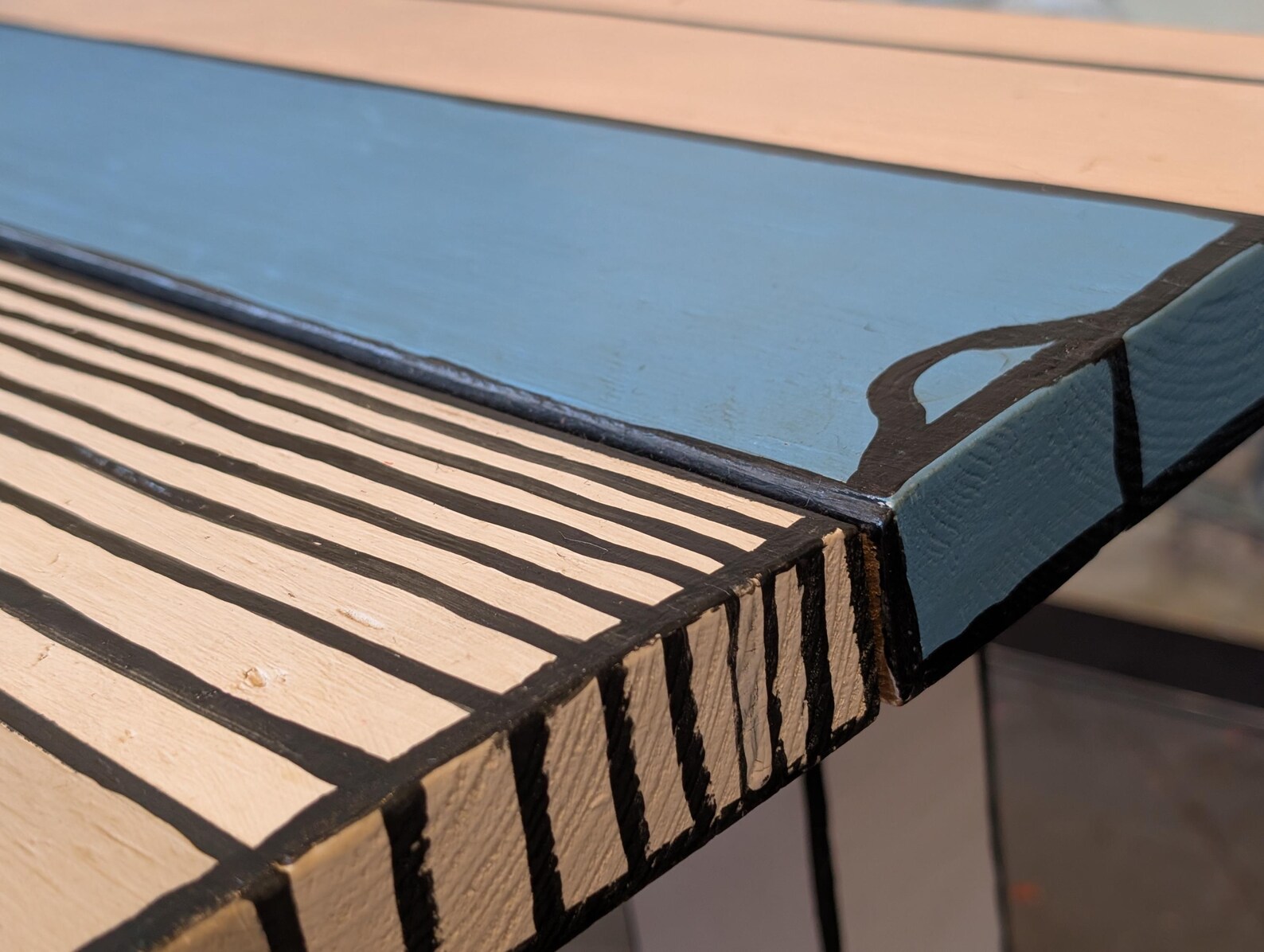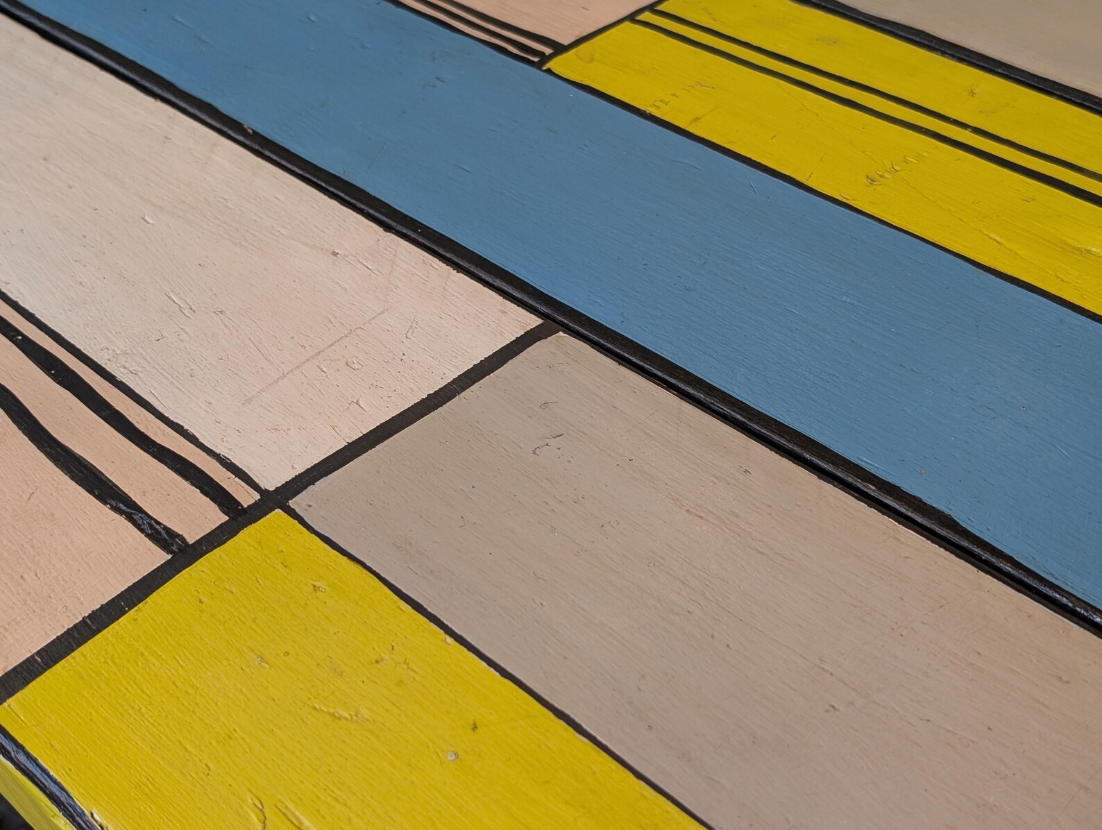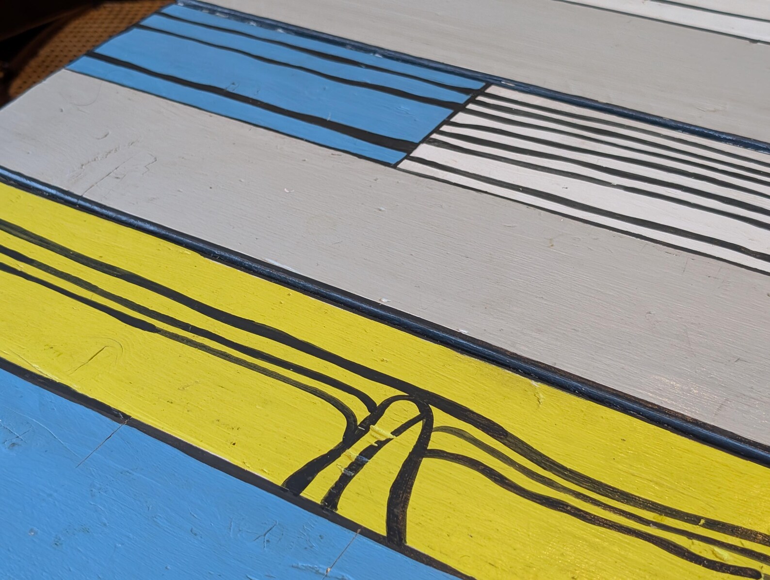 A truly unique and incredibly funky piece of South Coast vintage design, hand painted in the style of Richard Woods and Sebastian Wrong’s marvellous ‘Wrongwoods’ range for Established & Sons. Constructed from salvaged pieces of the Brighton West Pier and designed into a one off, vibrant piece that has history, character and style in abundance!