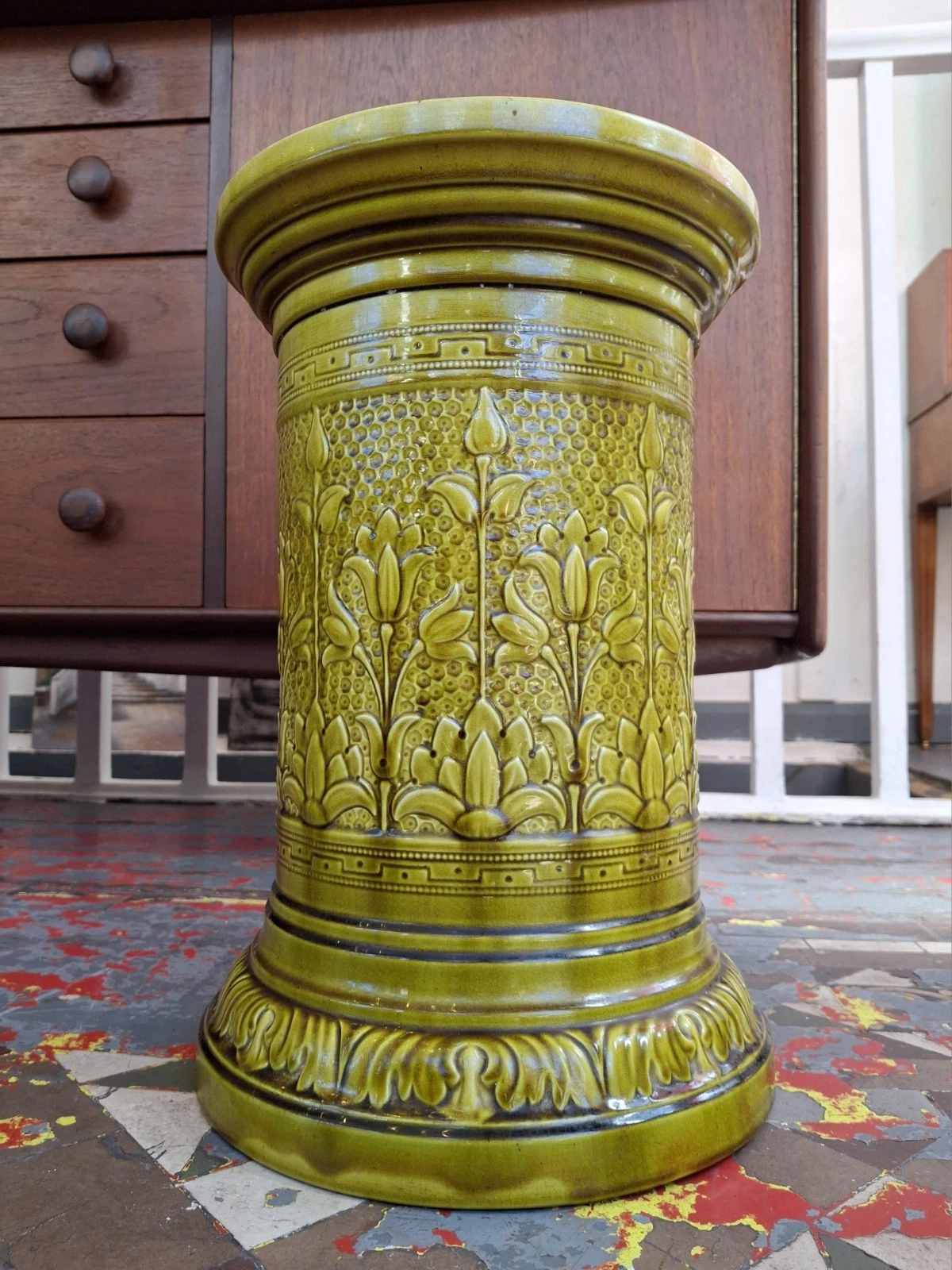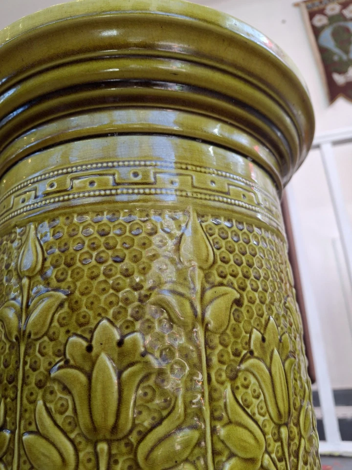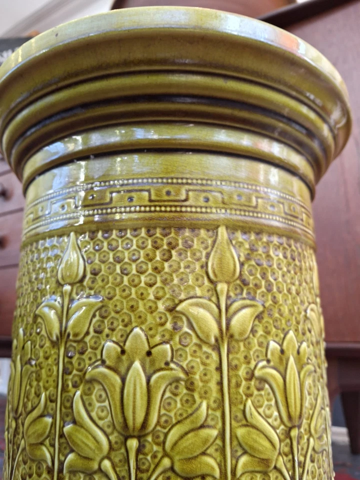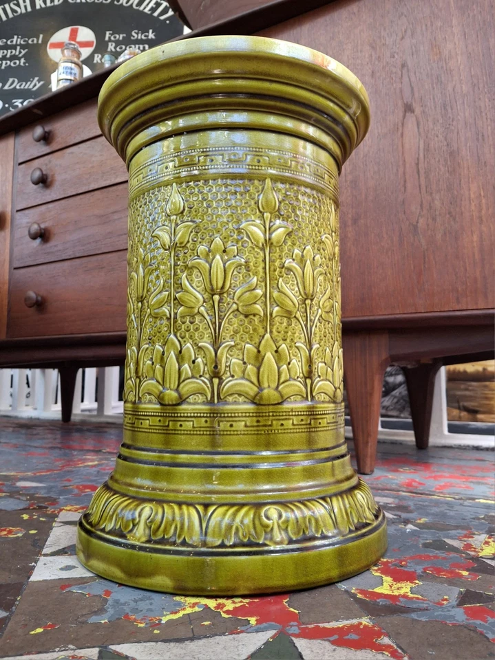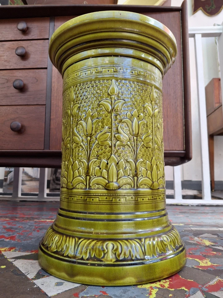 In a delightful autumnal green glaze & boasting floral & Greek key motifs this late 19th century decorative plinth or stand by Leeds Art Pottery would make the perfect display base for anything you see fit!