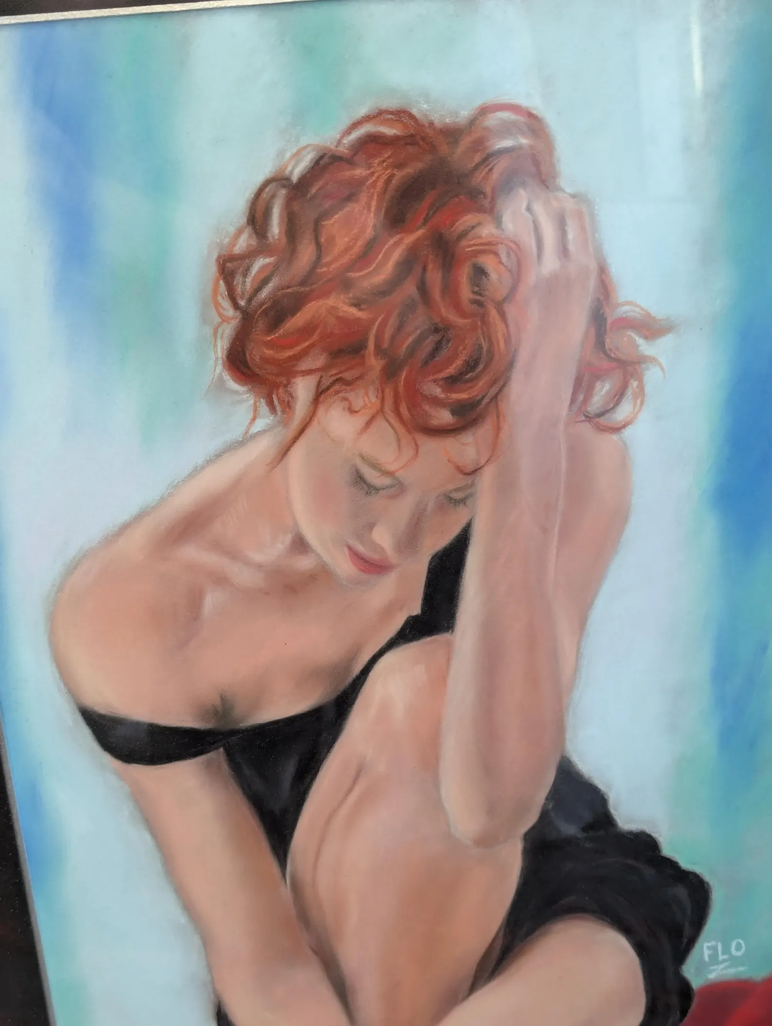A nicely executed, striking portrait of a red haired lady in Oil Pastels, framed and signed by the artist.