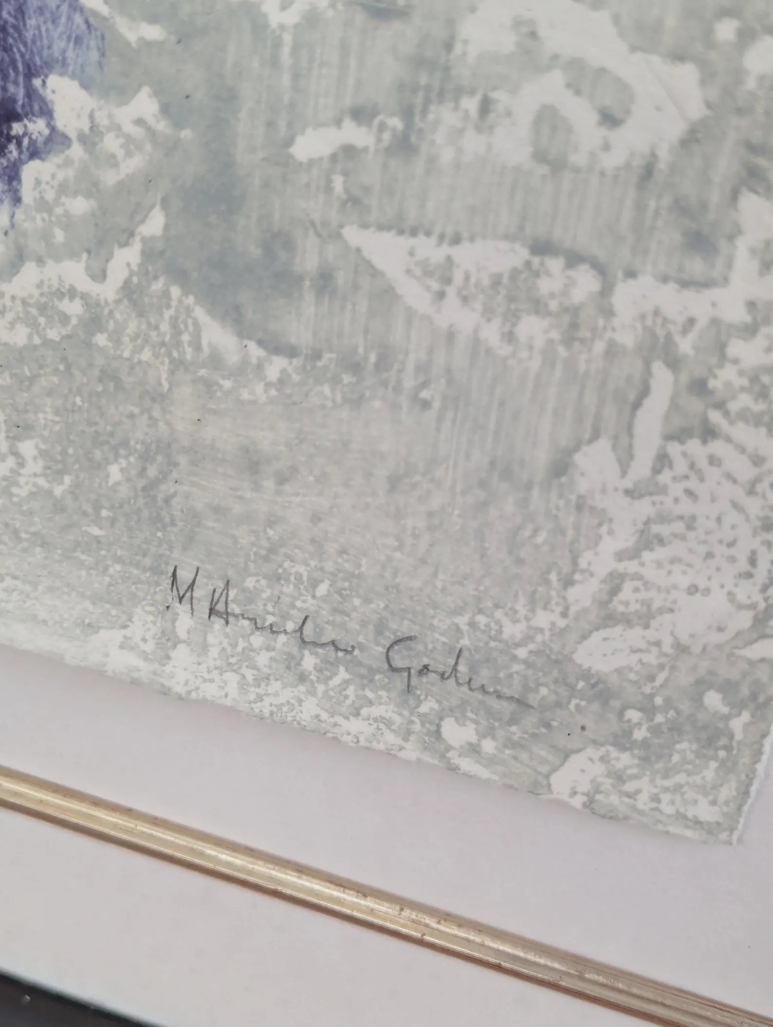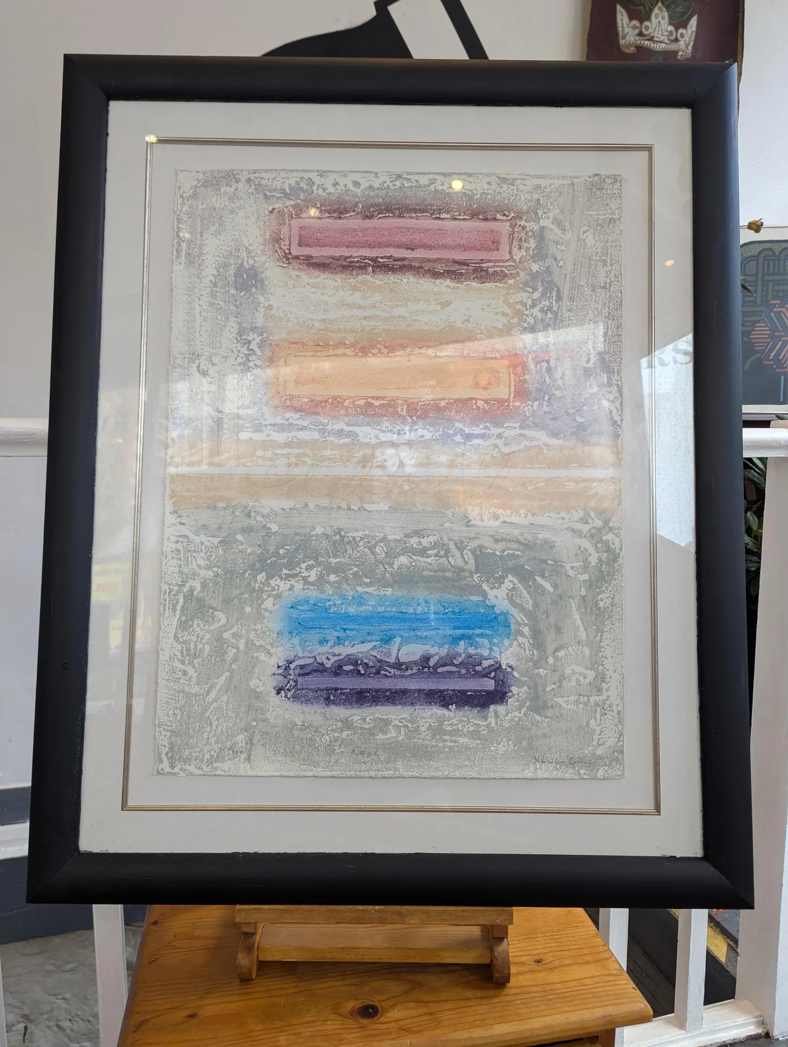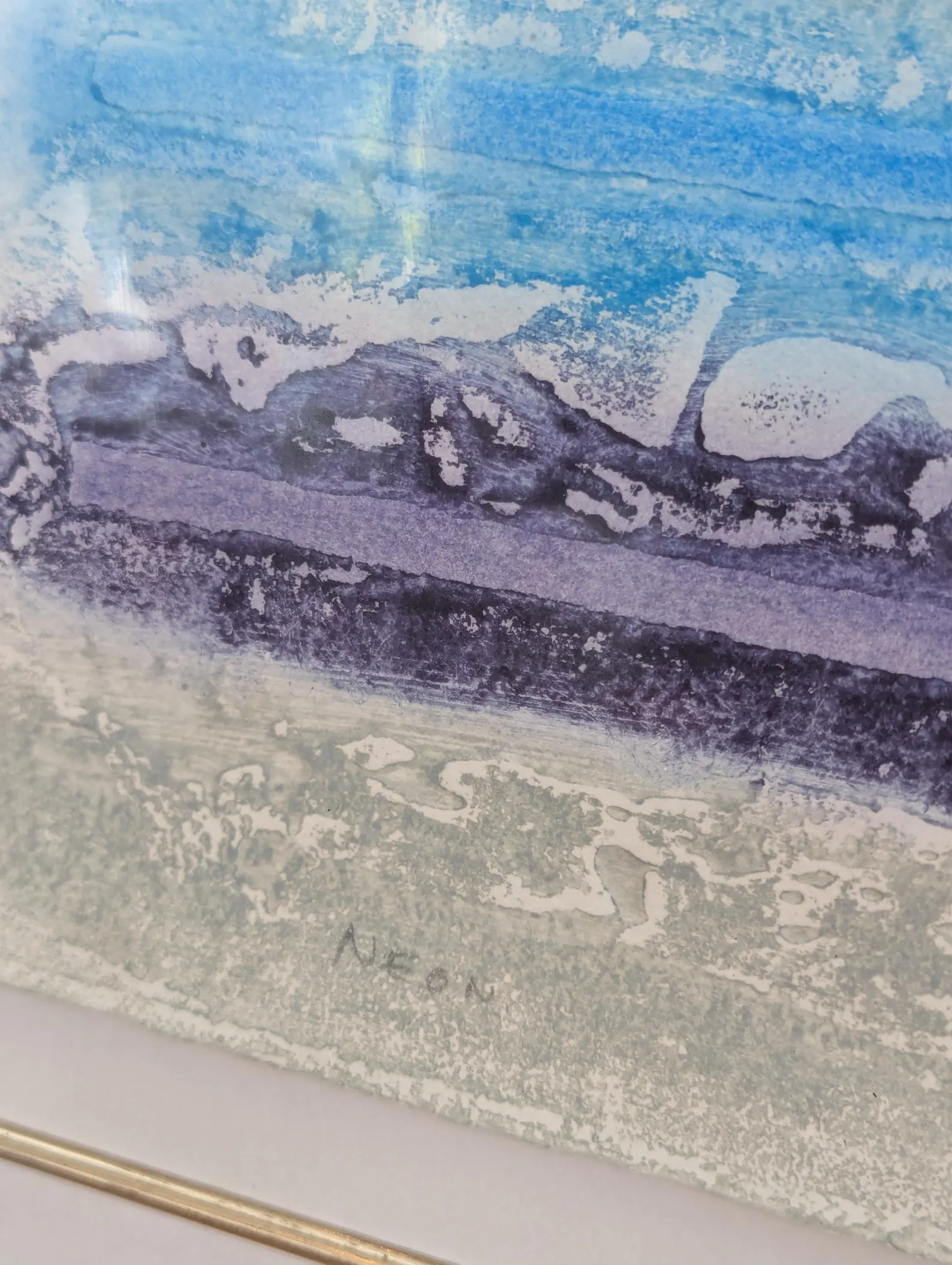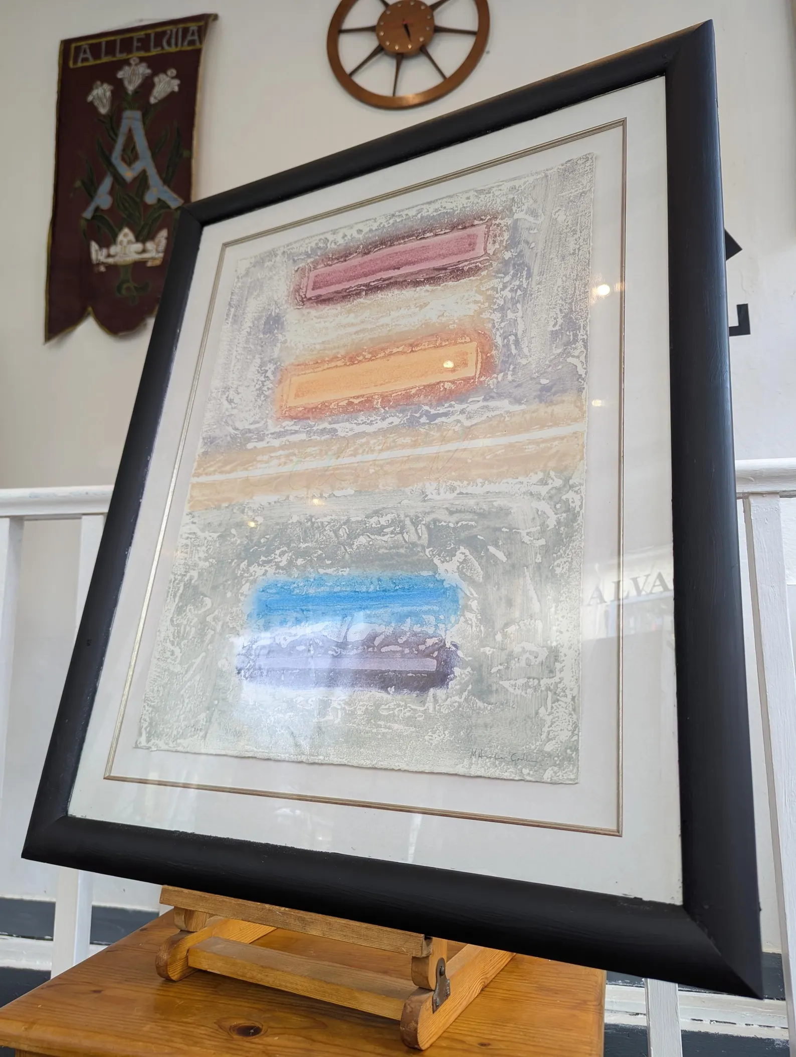 Eye catching, colourful and in a contrasting black chalk paint frame this late 20th century lithograph screenprint entitled ‘Neon’ is signed by the artist and is part of a short ltd edition run.