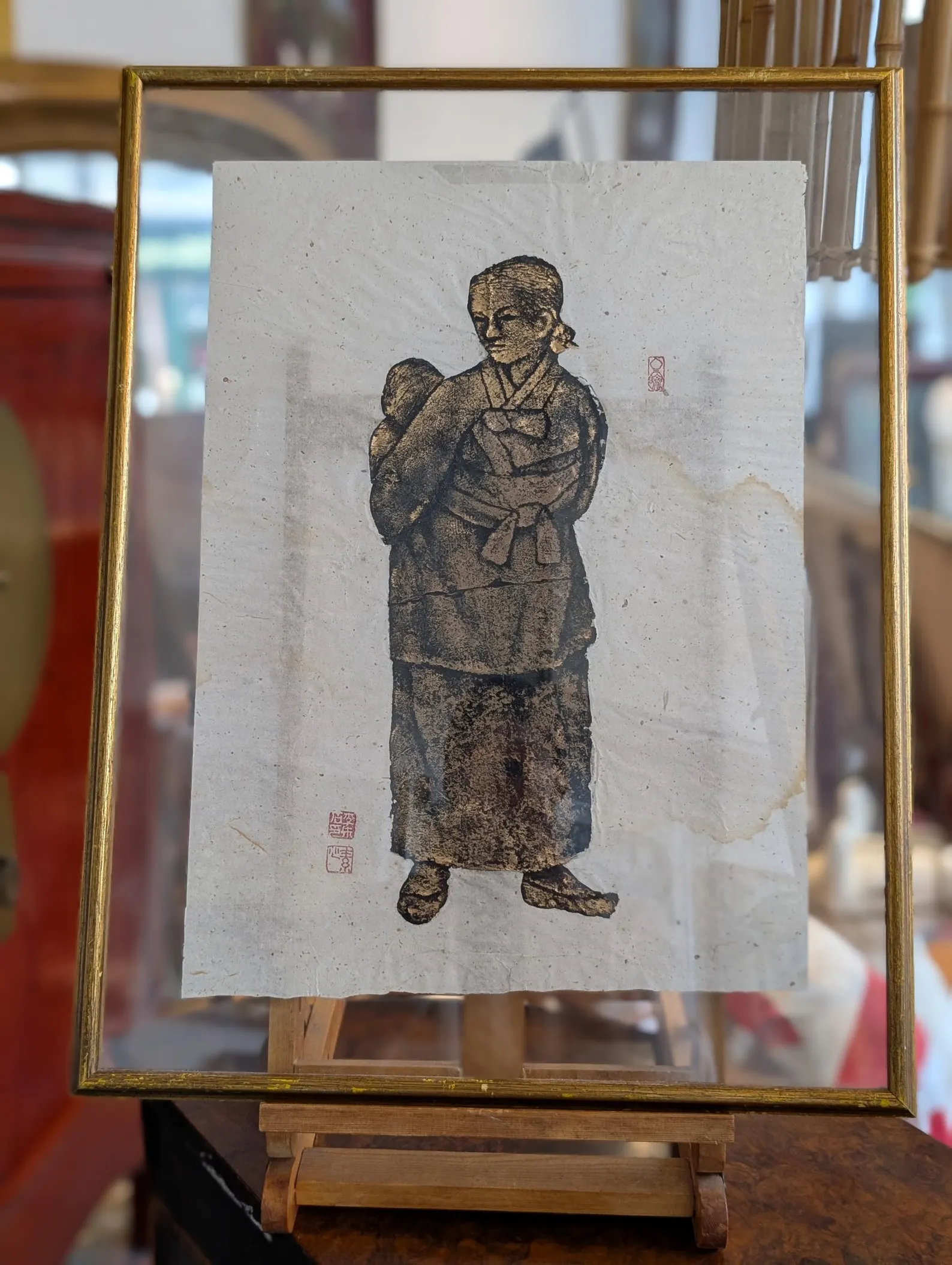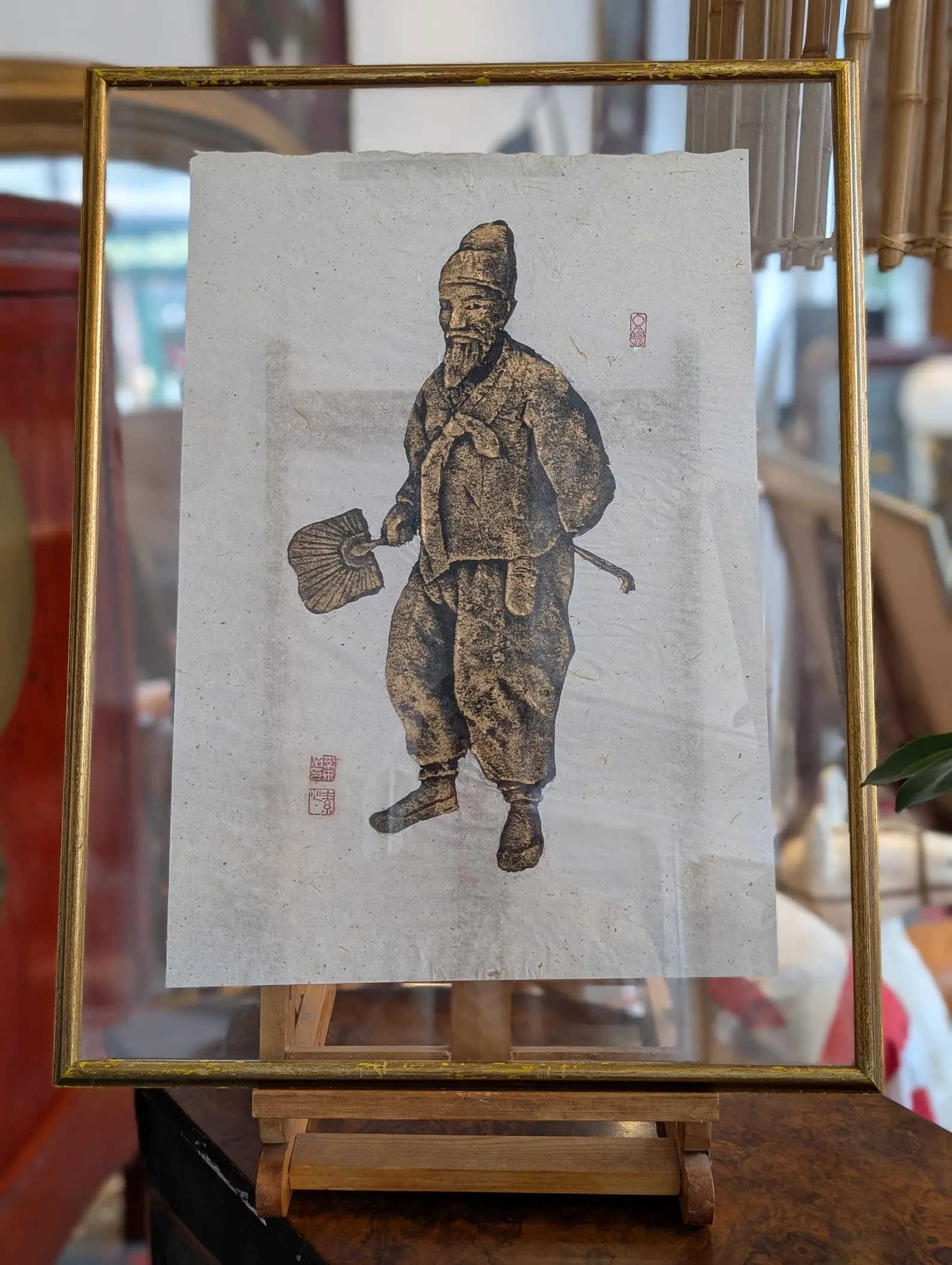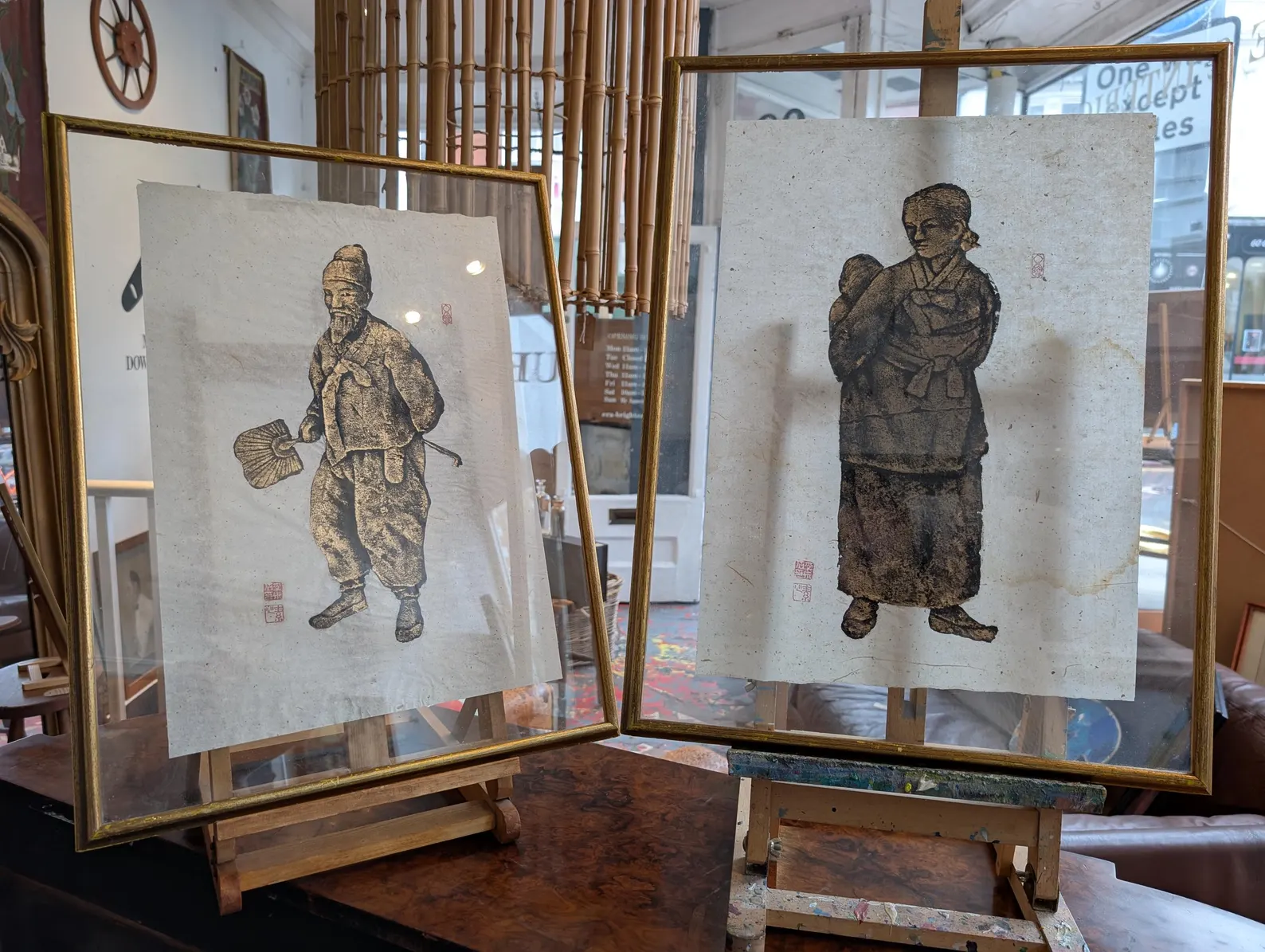 A pair of very rare artworks created by Korean artist Yi Jea Sea in the 1950s. The artworks are traditional ancestral rubbings on Hanji or Rice Paper, showcasing intricate characters and design very nicely framed in a double glassed frame. These Korean art works are a collectible, unique and visually striking addition to any collection or space.