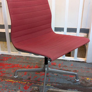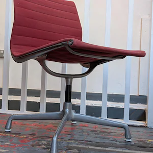 A true design classic the original Herman Miller Eames EA105 Desk Chair with aluminium frame, tipped white feet and oxblood fabric upholstery the epitome of comfort, style and timeless mid century iconic design.