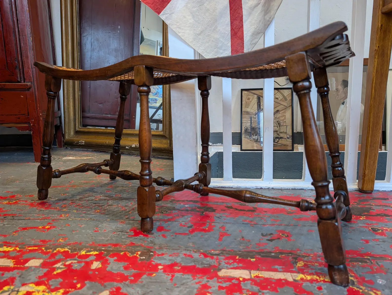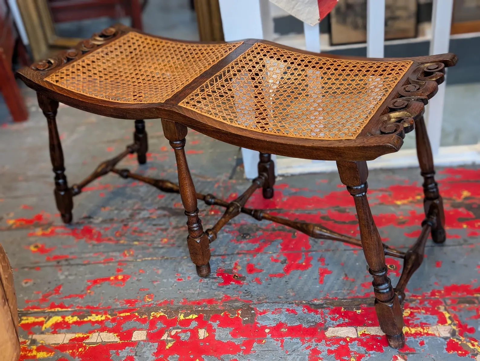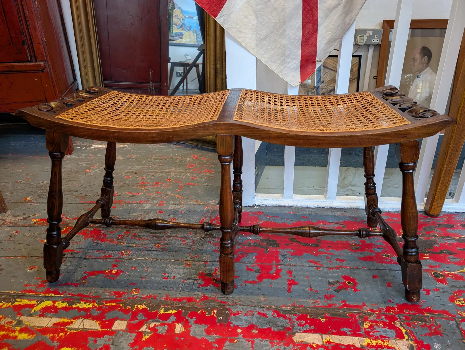A charming piece of 19th Century English Arts and Crafts period design, this lovely double hall seat or bench is expertly made from turned oak with a gorgeous rattan seat. The perfect occasional seating piece for the entryway or living space.