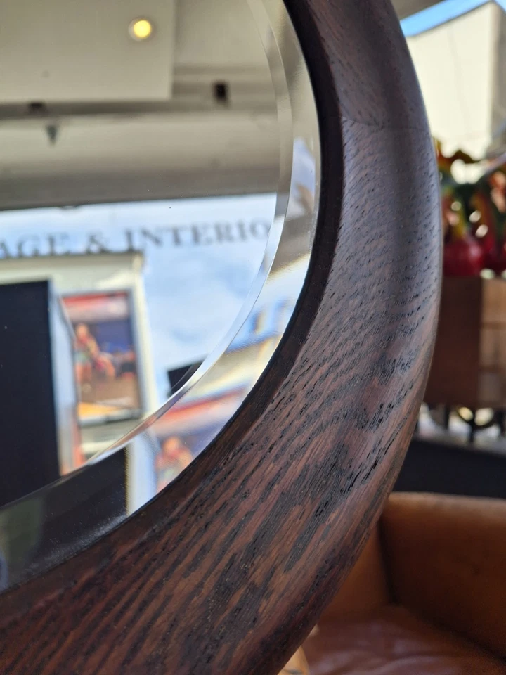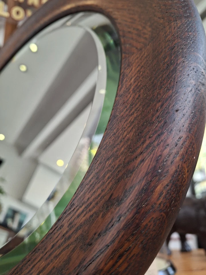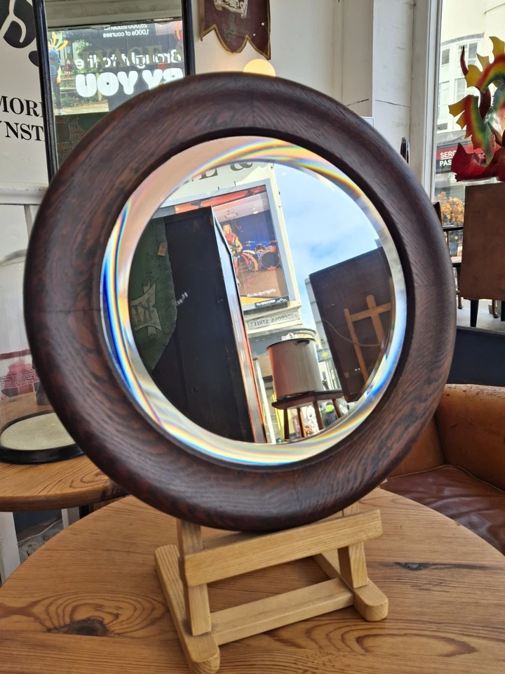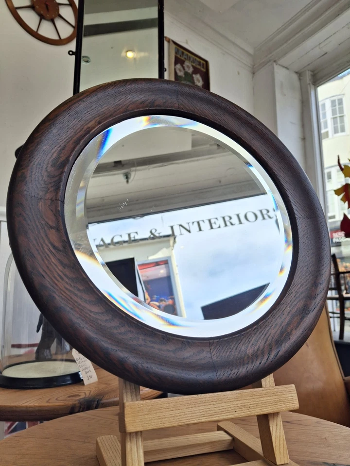 A handsome & functional piece of early 20th century interiors this gorgeous wall or vanity mirror boasts a superb heavyweight bevelled plate & high quality oak frame.