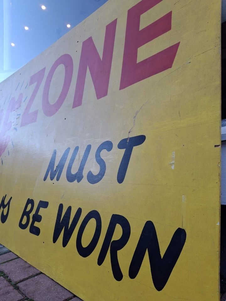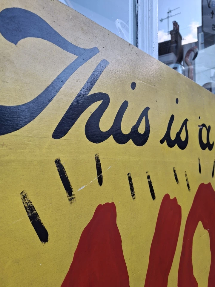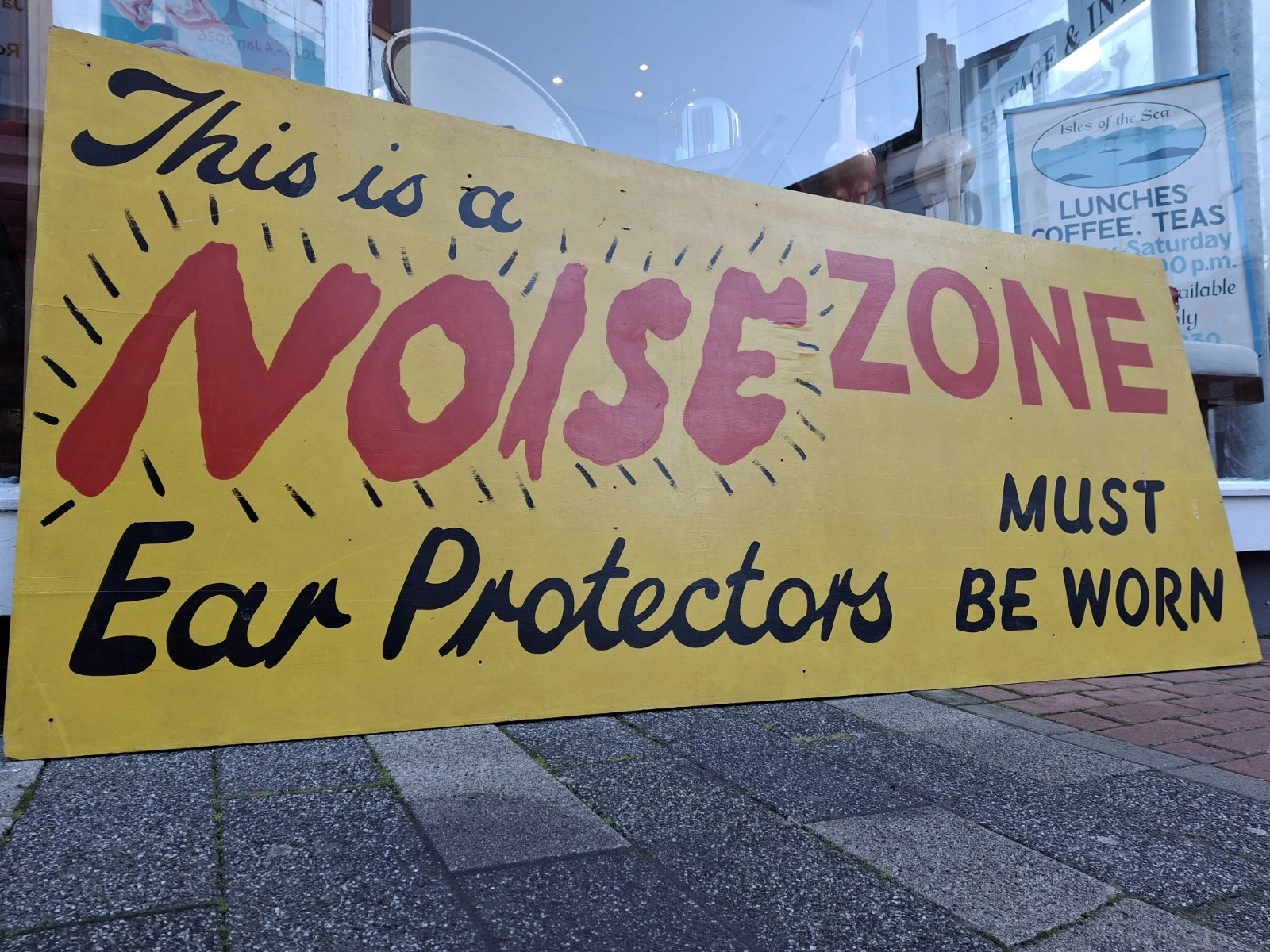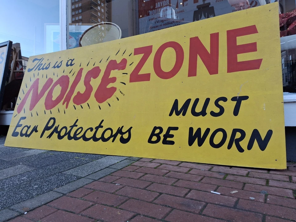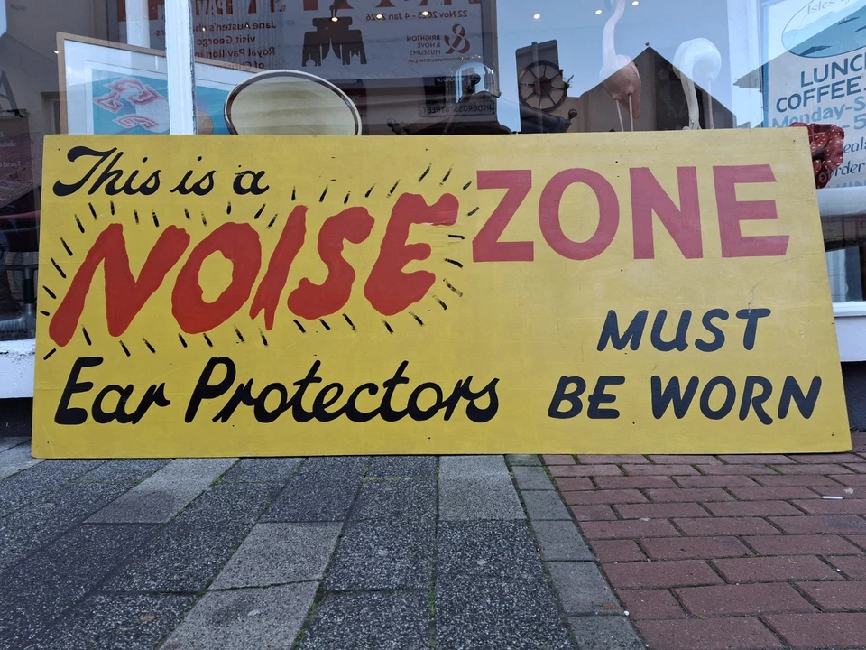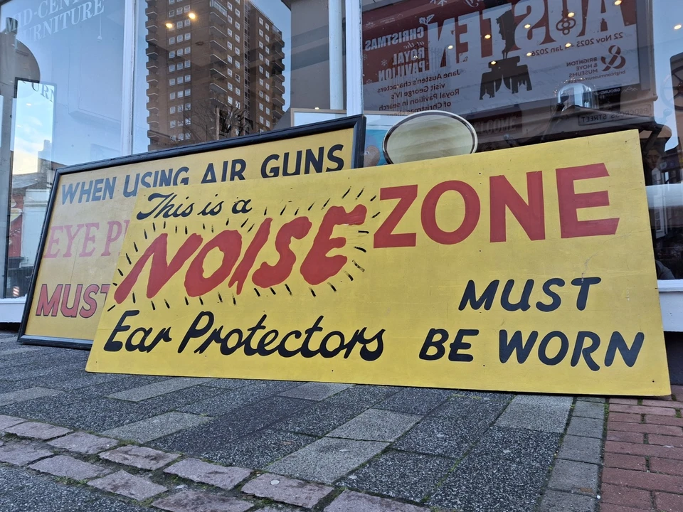 Decorative salvage at its best! This huge hand painted noise warning sign originates from an East Sussex lumber yard.