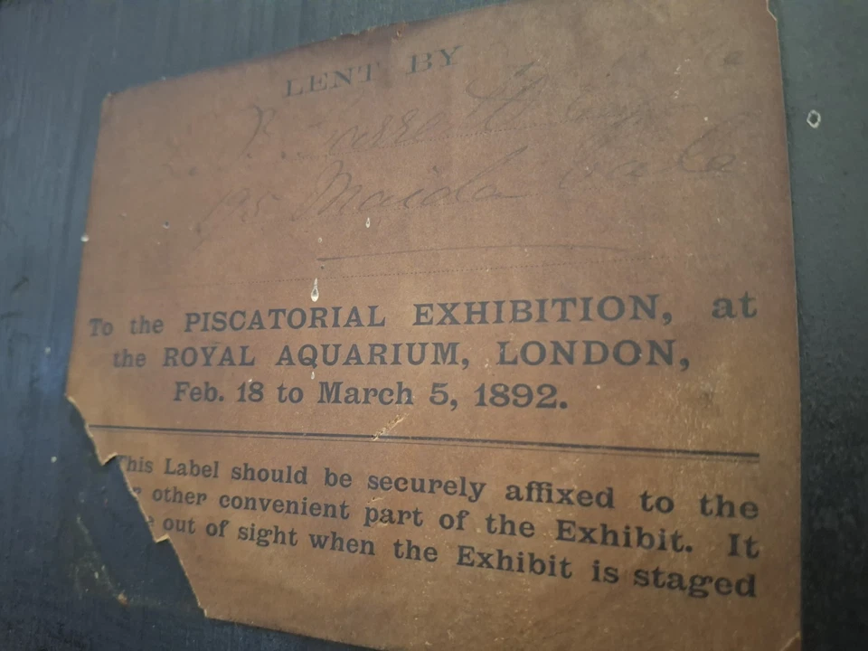 J Cooper & Sons labels to each, along with anglers identity & in one case a Royal Aquarium exhibition identifying tag.